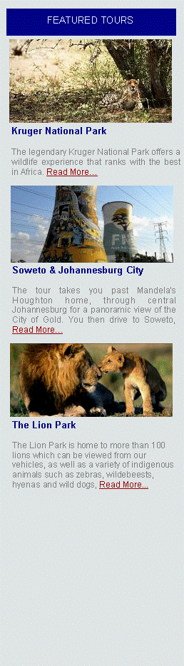 Townships Cities Museums Heritage Sites Theme Parks Zoological Gardens Beach Fronts Stadiums Game Reserves & Lodges |